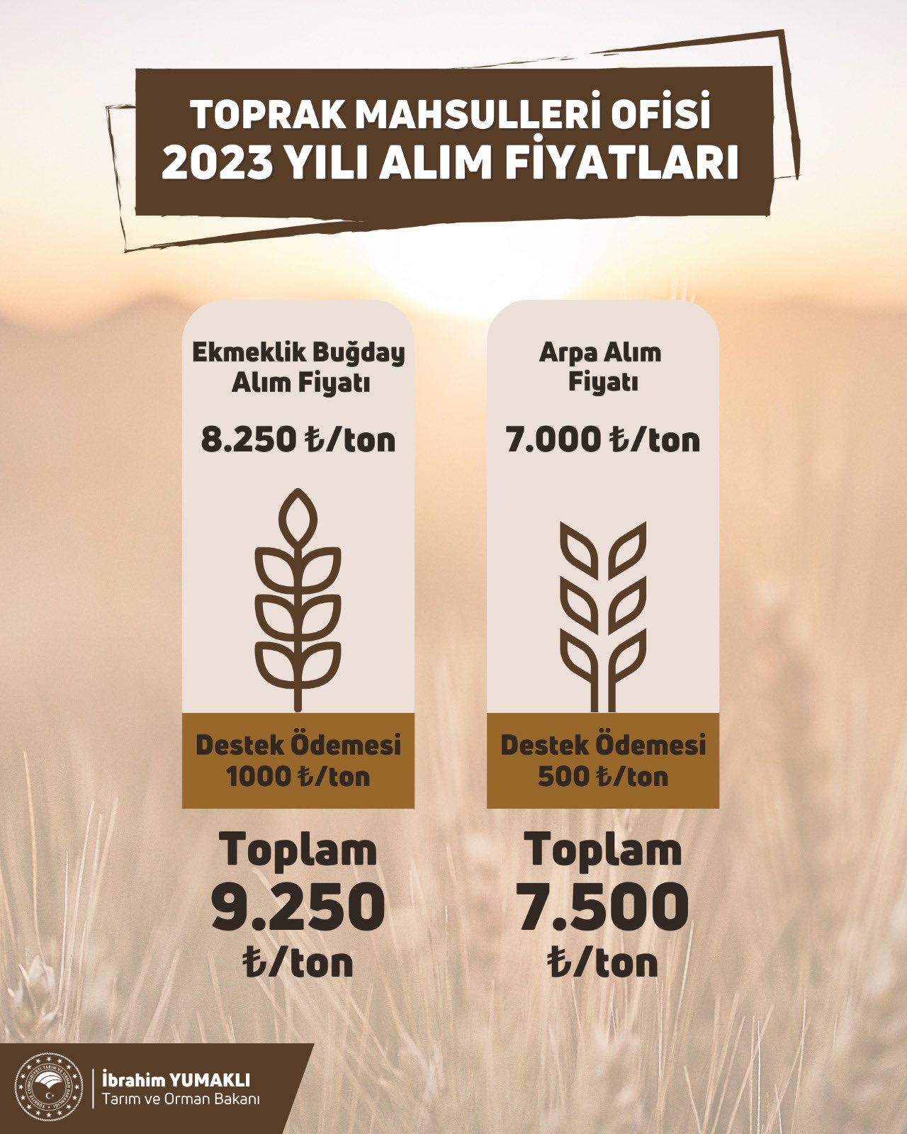 Toprak Mahsulleri Ofisi, 2023 yılı buğday ve arpa alım fiyatlarını belirledi. "Hububat Üretim Primi" desteğiyle birlikte üreticilerimizin eline ton başına ekmeklik buğdayda 9 bin 250 TL, arpada ise 7 bin 500 TL geçecek