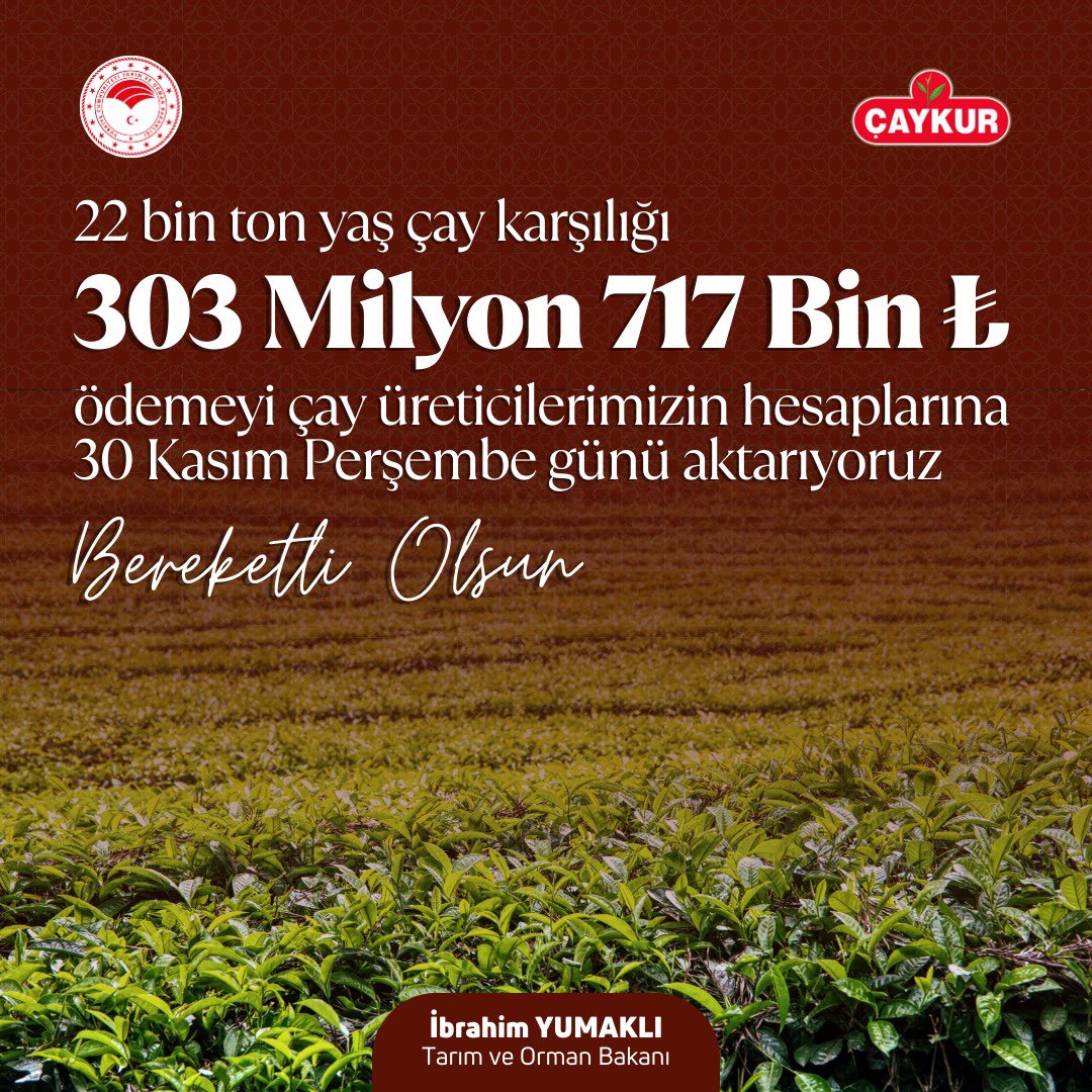 Bakan Yumaklı, yaptığı açıklamada, "ÇAYKUR aracılığıyla gerçekleştirilen 22 bin ton yaş çay alımı karşılığında, çay üreticilerine 30 Kasım Perşembe günü toplamda 303 milyon 717 bin TL ödemenin hesaplarına aktarılacağını belirtti. Haberin ardından bölgedeki çay üreticileri, bu gelişmeyi olumlu bir adım olarak değerlendiriyor." dedi.