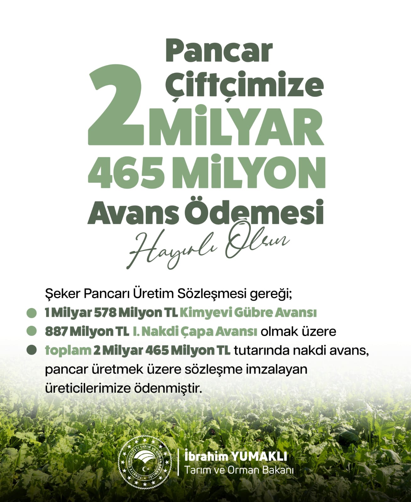 Tarım ve Orman Bakanı İbrahim Yumaklı, 2 milyar 465 milyon lira avans ödemesinin pancar üreticilerinin hesaplarına aktarıldığını açıkladı.