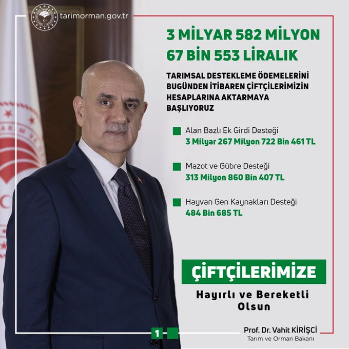 "Tarım ve Orman Bakanlığı olarak vermiş olduğumuz desteklerle üreticilerimizin her zaman yanında olduk. Üreticilerimize desteklerini devam ettiren Bakanlığımız, bu kapsamda toplamda yaklaşık 5 milyar 582 milyon 67 bin 553 liralık destekleme ödemesini bugünden itibaren üreticilerimizin hesaplarına aktarmaya başlayacak. Verilecek destekleme ödemeleri;