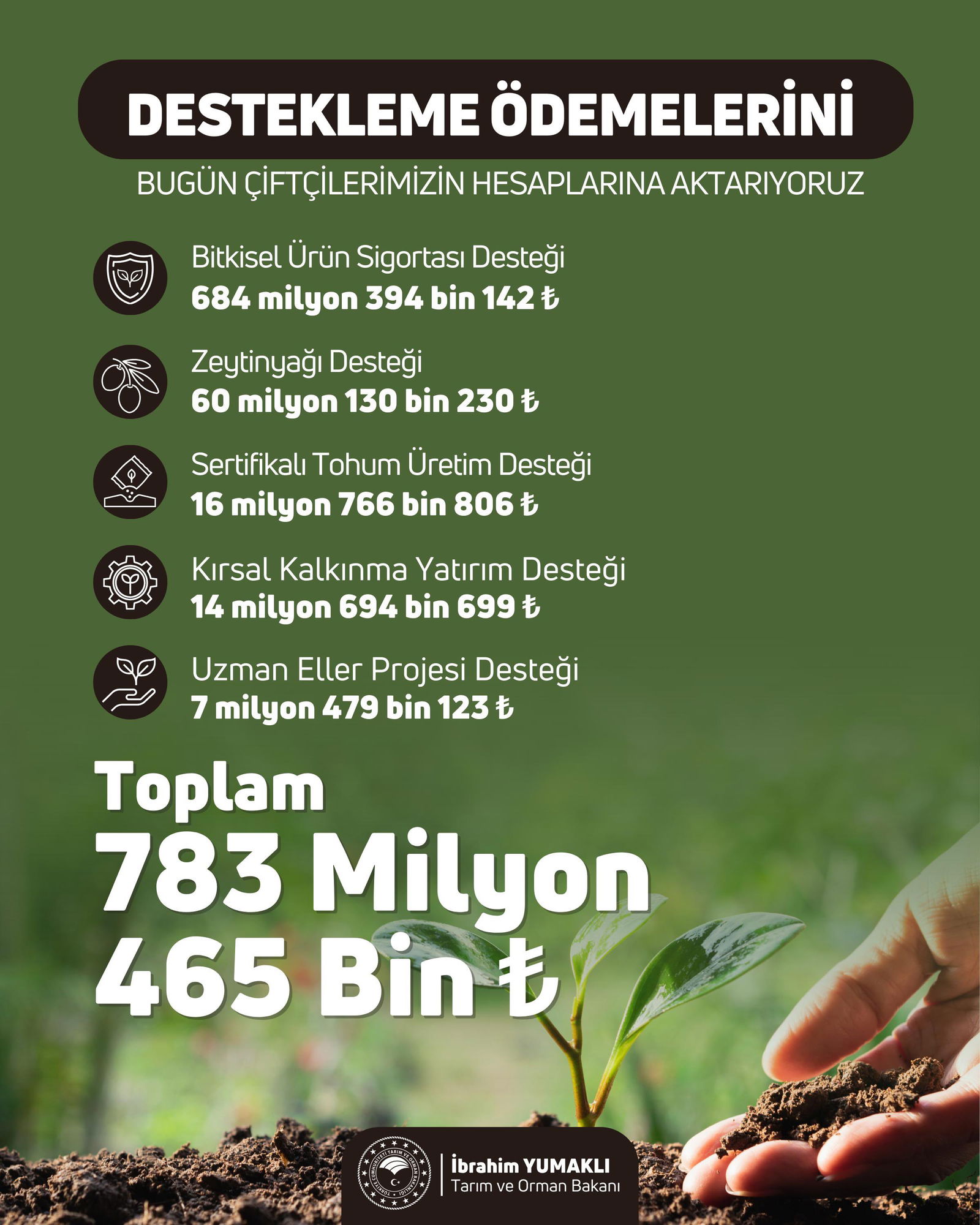 olmak üzere toplam 783 milyon 465 bin TL tarımsal destek ödemesi bugün çiftçilerimizin hesaplarına aktarılacak.