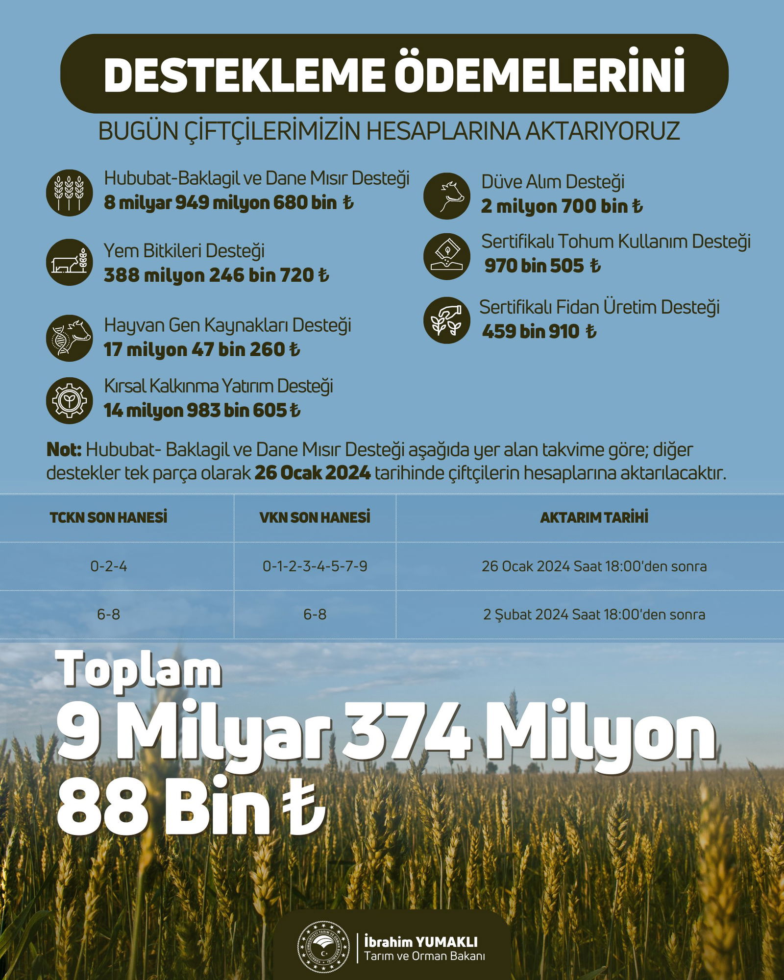 Diğer desteklemeler ise tek dilim halinde 26 Ocak 2024 tarihinde ödenecek.