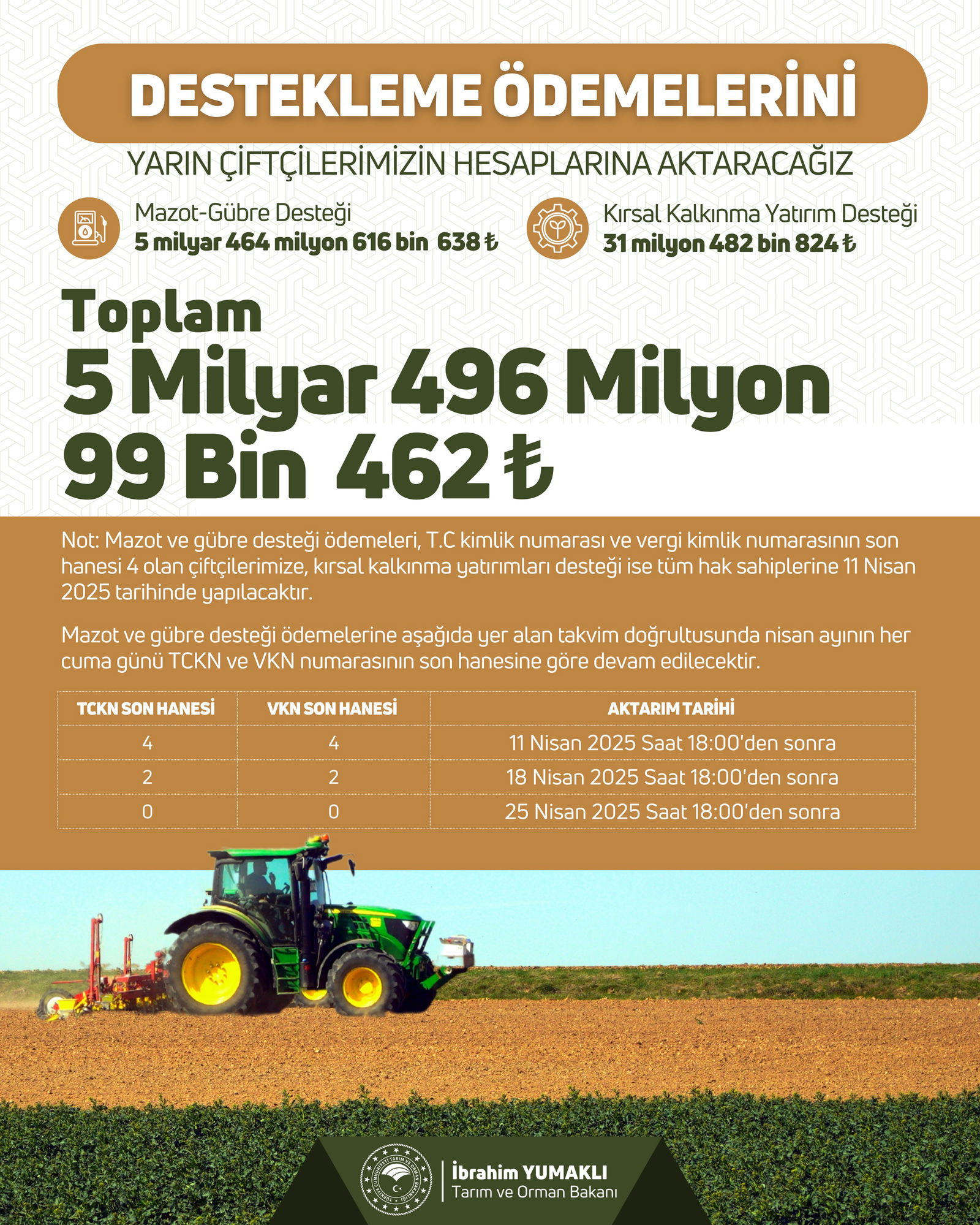 Not: Mazot ve gübre desteği ödemeleri, T.C. kimlik numarası ve vergi kimlik numarasının son hanesi 4 olan çiftçilerimize, kırsal kalkınma yatırımları desteği ise tüm hak sahiplerine 11 Nisan 2025 tarihinde yapılacaktır.