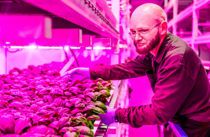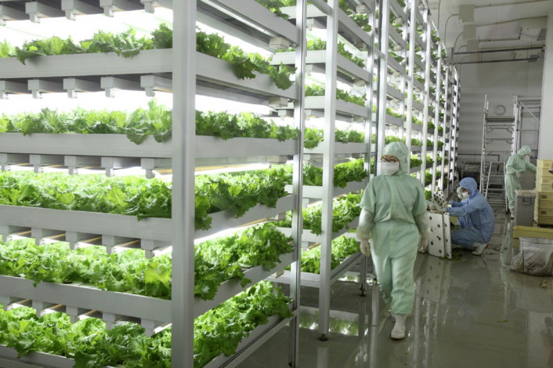 Çiftlikte yeşillikler, hidroponik olarak yüksekliği 7.5 m bulan dikey raflarda bilgisayar kontrollü özel LED ışıkların altında yetiştirilerek haftada 2 kez ürün elde ediliyor.