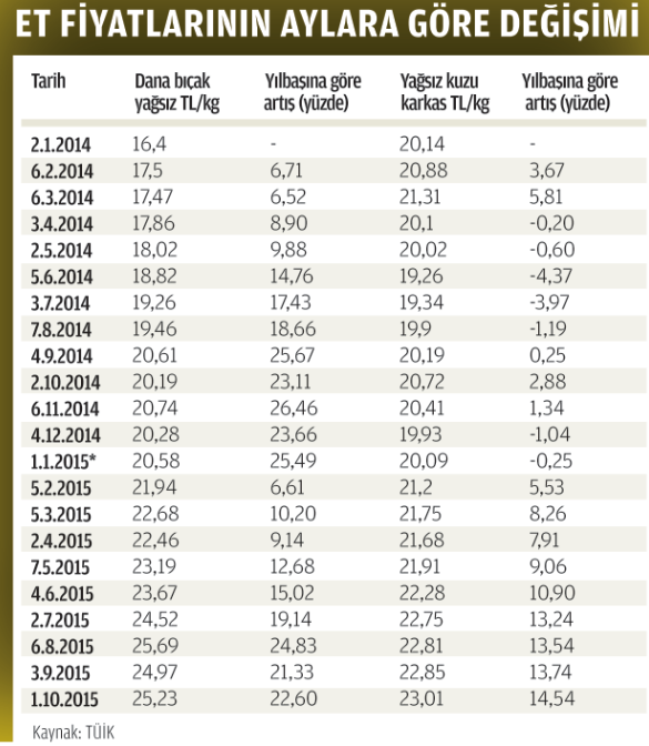 Türkiye, et fiyatlarındaki artışı dizginlemek için yeniden ithalat silahına sarıldı. 2014'ün ilk 8 ayında 81 milyon dolarlık canlı büyükbaş ve küçükbaş ithal edilirken bu rakam 2015'in aynı döneminde yüzde 55 artarak 125,1 milyon dolara ulaştı. Ancak ithalattaki yüzde 55'lik artış da fiyatları dizginlemek için yeterli olmadı. Canlı hayvan ithalatı, fiyatları kısa süre aşağı çekebildi. Temmuz sonunda 25,85 lirayı gören ‘dana kesim yağsız' et fiyatı, 24,10 liraya kadar geriledikten sonra yeniden 25 liranın üzerine çıktı. Ekim ayının ilk günündeki et fiyatı ise 25 lira 23 kuruş. Türkiye'de et fiyatları yıllık yüzde 20'nin üzerinde artış kaydederken dünyada tam tersi bir rüzgâr esmeye başladı. Dünyada fiyatlar 2014'ten bu yana küçükbaşta yüzde 19,6, büyükbaşta ise yüzde 2,1 geriledi.