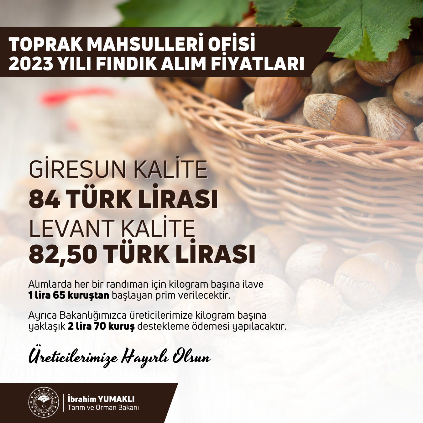 Bakan Yumaklı; Toprak Mahsulleri Ofisi 2023 yılı fındık alım fiyatlarını açıkladı.