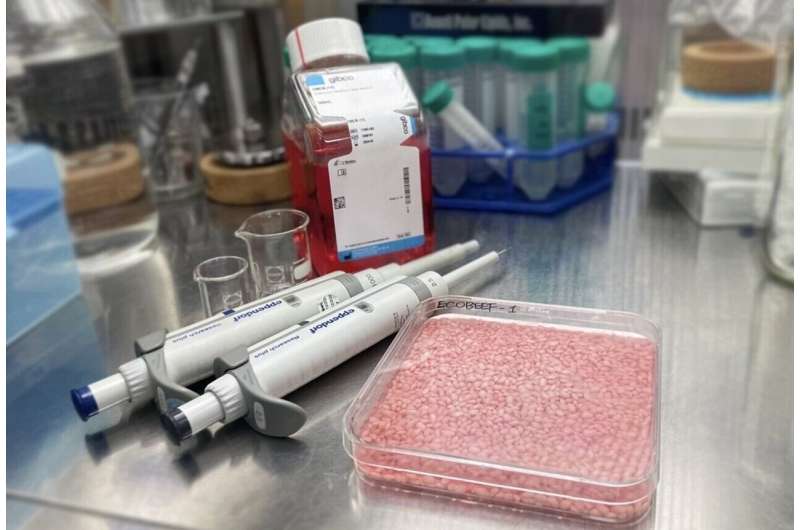 Tahıl, sığır eti hücrelerinin pirince tutunmasına yardımcı olmak için balık jelatini ile kaplandı ve ardından 11 gün boyunca bir petri kabında kültüre bırakıldı.