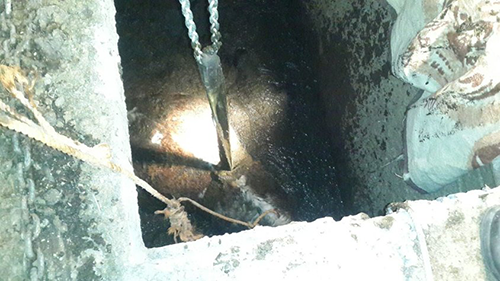 Gecenin karanlığında ışıklar yardımıyla çukurun içinde bekleyen inek halatlarla bağlandı.