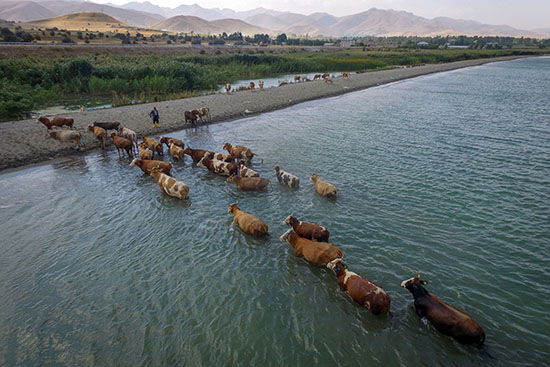 Çocuklar, Akdamar Adası'nın karşı kıyılarında gün boyu otlattıkları hayvanlarını, sıcaklığın iyice bastırmasıyla göle sokuyor.