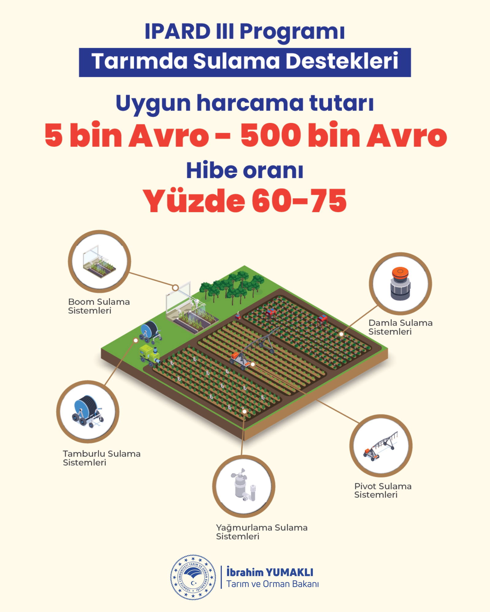 Daha önce yalnızca sera projeleri için verilen sulama sistemi desteklerinin IPARD III Programı ile artık açık alanda da geçerli hale geldiğini vurgulayan Yumaklı, "Bu kapsamda, 500 bin avroya kadar uygun harcamaların yüzde 75'ine kadar hibe desteği sağlıyoruz. Bir yandan tarımsal üretimi artırırken diğer yandan su kaynaklarımızı koruma kararlılığımızı sürdürüyoruz." değerlendirmesinde bulundu.