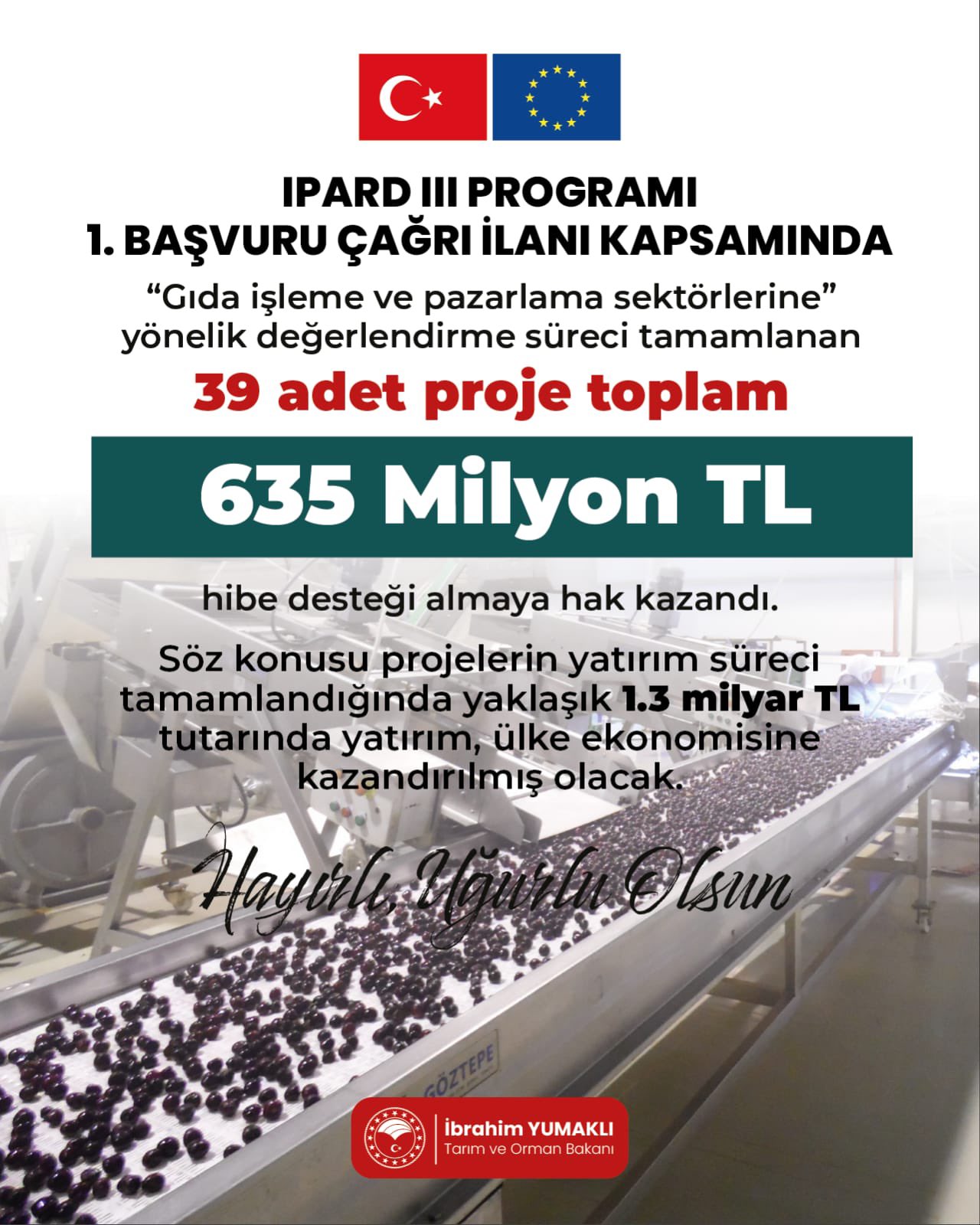 "42 ilde yürürlükte olan IPARD desteklerini artık 81 ilimize yaygınlaştırdık. Bu kapsamda ilk çağrı ilanında değerlendirme süreci tamamlanan 39 proje, toplam 635 milyon lira hibe almaya hak kazandı. Projelerin yatırım sürecinin tamamlanmasıyla ülkemiz ekonomisine yaklaşık 1,3 milyar lira katkı sağlanacağını öngörüyoruz."