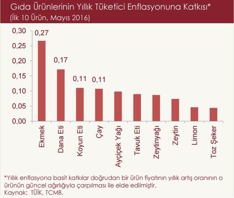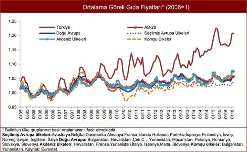 Türkiye'deki gıda fiyatlarının ekonomik büyüklük, coğrafi yakınlık ve iklim koşullarına göre sınıflandırılmış Avrupa Birliği (AB) üyesi ülke gruplarıyla karşılaştırıldığı araştırmada, "Gıda enflasyonundaki gelişmeler 2006-2015 dönemi için incelendiğinde, Türkiye'de ortalama gıda ve TÜFE enflasyonunun diğer ülke gruplarından belirgin şekilde yüksek olduğu görülmektedir. 2010 sonrası dönemde ortalama gıda enflasyonunun tüm ülke gruplarında gerilediği, Türkiye'de ise bu gerilemenin oldukça sınırlı oranda olduğu gözlenmiştir" deniliyor.
