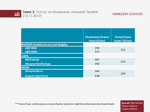 Türkiye'de hububat ürünlerinin fiyatları düşük verimlilik gibi çeşitli yapısal sorunlar ve korumacılık sebebiyle dünya fiyatlarının üzerinde seyretmekte. Tablo 2'de 13 Kasım 2017 tarihi itibarıyla buğday, arpa ve mısırın yurt içi piyasa fiyatları ile uluslararası ihracat fiyatları yer almakta. Hububat ürününün türüne göre, yurt içi fiyatların uluslararası ihracat fiyatlarına göre yüzde 20 ile yüzde 35 arasında değişen oranlarda daha pahalı olduğu görülmekte.