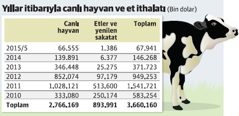 Uzun yıllar deli dana hastalığını gerekçe göstererek canlı hayvan ve ithalatını ‘kontrol belgesi düzenlememe’ yoluyla yasaklayan Türkiye, arz sıkıntısı nedeniyle 2010 yılında zorunlu olarak canlı hayvan ve et ithalatına başlamıştı. 2010 yılından bu yana 2015 yılı Mayıs ayı sonu itibarıyla 893.9 milyon doları et olmak üzere toplam 3 milyar 660 milyon dolarlık canlı hayvan ve et ithalatı gerçekleştirildi. En yüksek et ithalatı ise 1.5 milyar dolar ile 2011 yılında yapıldı.