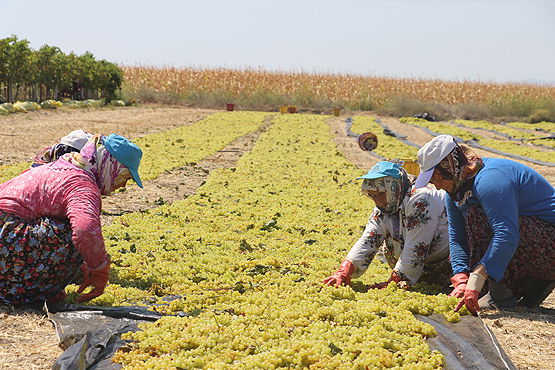 Bölgenin en önemli geçim kaynağı olan kuru üzüm için ağustos ayıyla birlikte bağlarda yoğun bir çalışma başlıyor. Sabahın ilk ışıklarıyla bağlardan toplanan yaş üzümler, potasyum ve zeytinyağlı karışıma batırıldıktan sonra metrelerce uzunluktaki sergilerde kurutulmaya bırakılıyor.