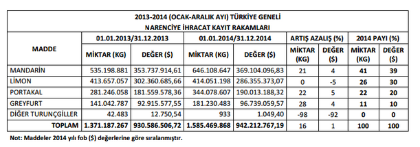 Türkiye’nin 2014 yılında gerçekleştirdiği 942 milyon 212 bin dolarlık narenciye ihracatında Mandalina 369 milyon 104 bin dolarlık tutarla ilk sırada yer alırken, limon 286 milyon 355 bin dolarla ikinci, portakal 190 milyon 13 bin dolarla üçüncü sırada yer aldı. Altıntop ihracatından ise Türkiye 96 milyon 739 bin dolar döviz elde etti.