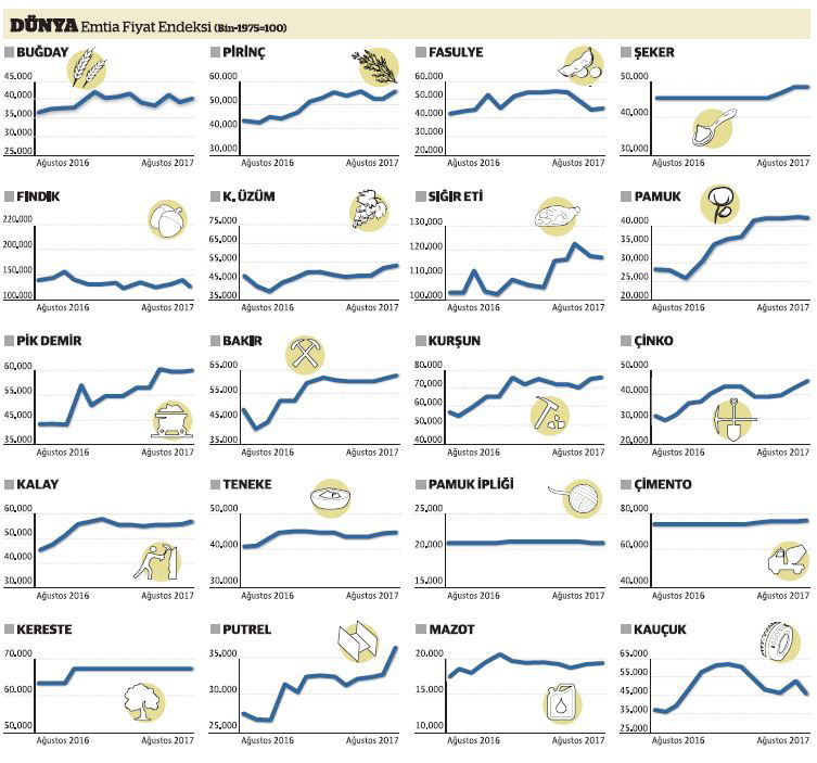 2016 -2017 Ağustos döneminde fiyat artışında ikinci sırada yüzde 39.3 ile çinko, üçüncü sırada ise yüzde 36.8 artışla kauçuk yer aldı. Endeks kapsamına giren diğer ürünlerde ise; pikdemirde yüzde 36.1, kurşunda yüzde 34.2, bakırda yüzde 31.3, putrelde yüzde 29.5, pirinçte yüzde 27.9, kalayda yüzde 26.6, mazotta yüzde 20 .8, sığır etinde yüzde 13.4, kuru üzümde yüzde 11.5, buğdayda yüzde 10.5, tenekede yüzde 10.2, kerestede yüzde 8.7, kuru fasulyede yüzde 7.1, şekerde yüzde 5.7, çimentoda yüzde 4.3, pamuk ipliğinde binde 2 fiyat artışı gerçekleşti. Son bir yılda fındık fiyatı ise yüzde 9.8 geriledi.