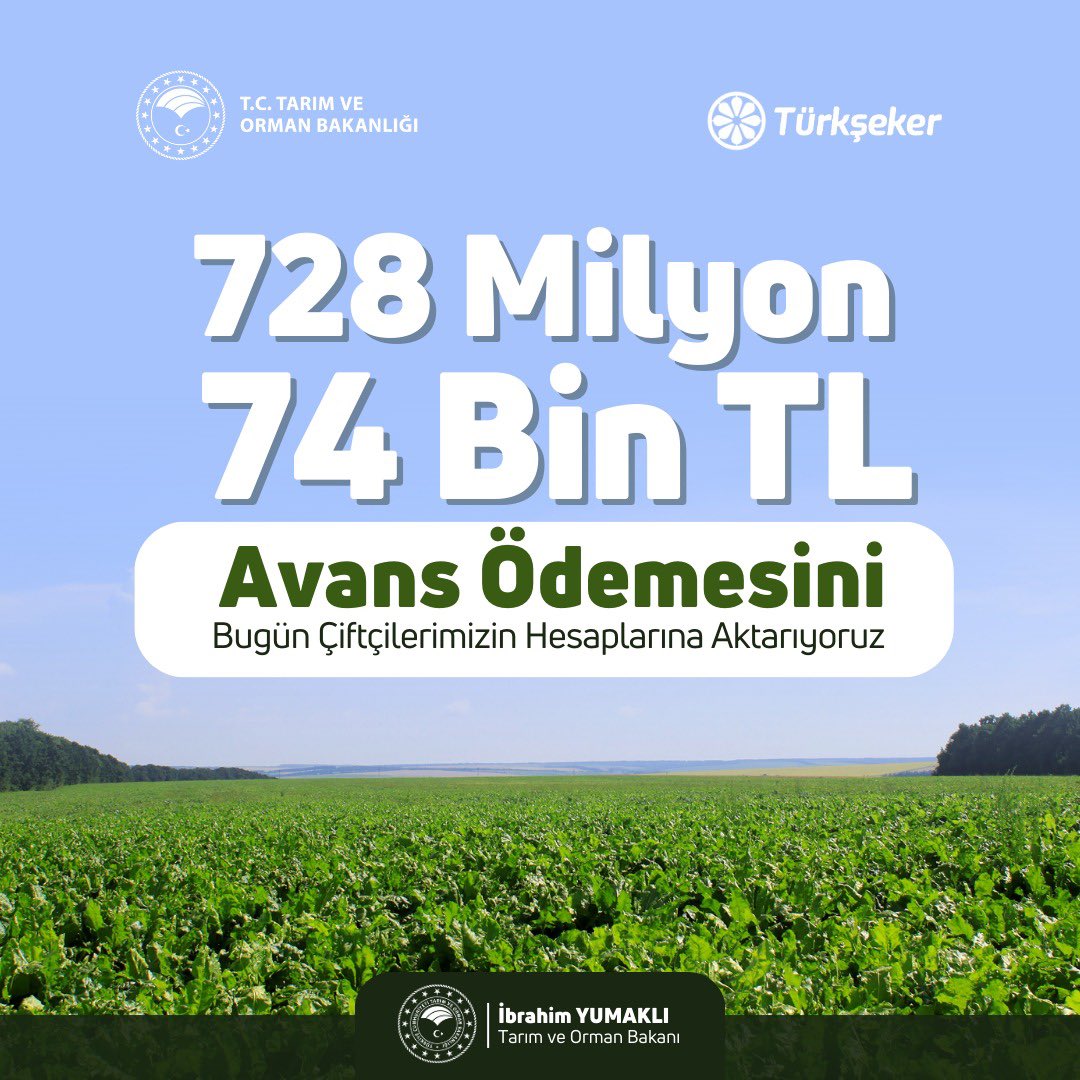Bakan Yumaklı, sosyal medya hesabından yaptığı paylaşımda, "Türkşeker aracılığıyla 728 milyon 74 bin TL avans ödemesini bugün pancar üreticilerimizin hesaplarına aktarıyoruz. Hayırlı ve bereketli olsun." ifadelerini kullandı.