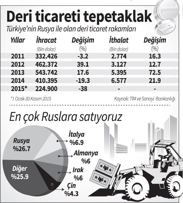İki ülke arasındaki kriz Rusların en çok rağbet ettiği deri sektörünü de vurdu. Ürünlerinin yüzde 90'ını Rusya ve Ukraynalılara sattıklarını belirten sektör temsilcileri, krizle birlikte birçok siparişi alamadıklarını söylerken, bu diplomatik krizin aşılamaması halinde, deri organize bölgeleri ve deri konfeksiyon atölyelerinin çökme riskiyle karşı karşıya kalacağını belirtti.