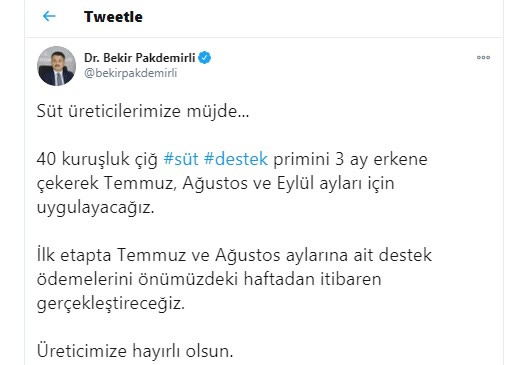 ?Tarım ve Orman Bakanı Bekir Pakdemirli, 40 kuruşluk çiğ süt destek primi ödemelerini 3 ay erkene çektiklerini duyurdu. Bakan Pakdemirli sosyal medya hesabından yaptığı paylaşımda, Süt üreticilerimize müjde... 40 kuruşluk çiğ süt destek primi ödemelerini 3 ay erkene çekerek Temmuz, Ağustos ve Eylül ayları içinde gerçekleştireceğiz. İlk etapta Temmuz ve Ağustos aylarına ait destekleri önümüzdeki haftadan itibaren ödeyeceğiz. Üreticimize hayırlı olsun" ifadelerini kullandı.