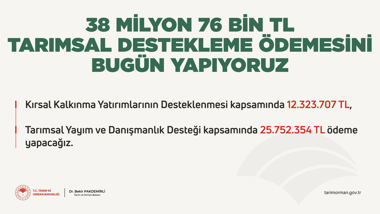 Tarım ve Orman Bakanı Dr. Bekir Pakdemirli sosyal medya hesabından yaptığı açıklamada 38 Milyon 76 Bin TL Tarımsal Destek Ödemesinin bugün yapılacağını açıkladı. <br />