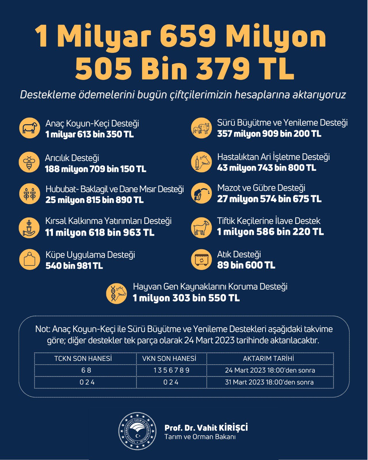 Vahit Kirişçi, 1 milyar 659 milyon 505 bin TL tarımsal destekleme ödemesini bugün çiftçilerimizin hesaplarına aktarılacağını açıkladı.