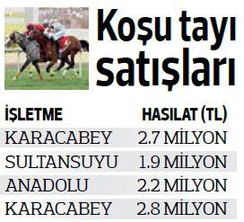 Yılın son koşu tayı satışında Karacabey İşletmesi yetiştirmesi 36 baş tay, ortalama 78 bin lira fiyatla toplam 2.8 milyon liraya alıcılarını buldu. Bu yılki koşu tayı satışlarında 176 tay satılırken, toplam 9.6 milyon lira gelir elde edildi.