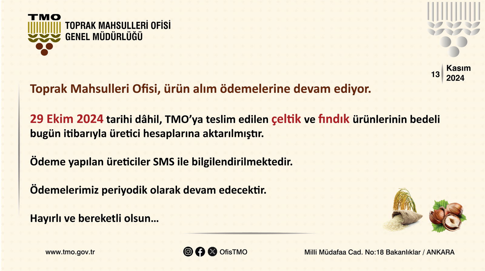 ?13 Kasım 2024 tarihi itibarıyla, 29 Ekim 2024 tarihine kadar TMO'ya teslim edilen çeltik ve fındık ürünlerinin bedelleri, üreticilerin hesaplarına aktarılmış durumda. Üreticiler, yapılan ödemeler hakkında SMS yoluyla bilgilendiriliyor.