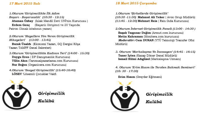 Bu yıl 2. kez düzenlenen etkinliğe başarılı girişimciler ve girişimci adayları katılıyor. Etkinlik İstanbul Üniversitesi Mühendislik Fakültesi/Avcılar’da gerçekleşiyor.Girişimciliğe İlk Adım Başarı ve Başarısızlık, Hayallere Yön Veren Girişimcilik Hikayeleri, Girişimcilikte Kadının Yeri ve Sosyal Girişimcilik “Sosyal Yardım Kuruluşları” adlı oturumlarla 17 Mart Salı günü ilk gerçekleştirilecek etkinliğin, ikinci gün başlıkları ise, Kurumsal Girişimcilik, İnternet Girişimcilik Paneli, Markalaşma ve İnovasyon, Erim Hısım ile Tersten Bakmak semineri şeklinde.