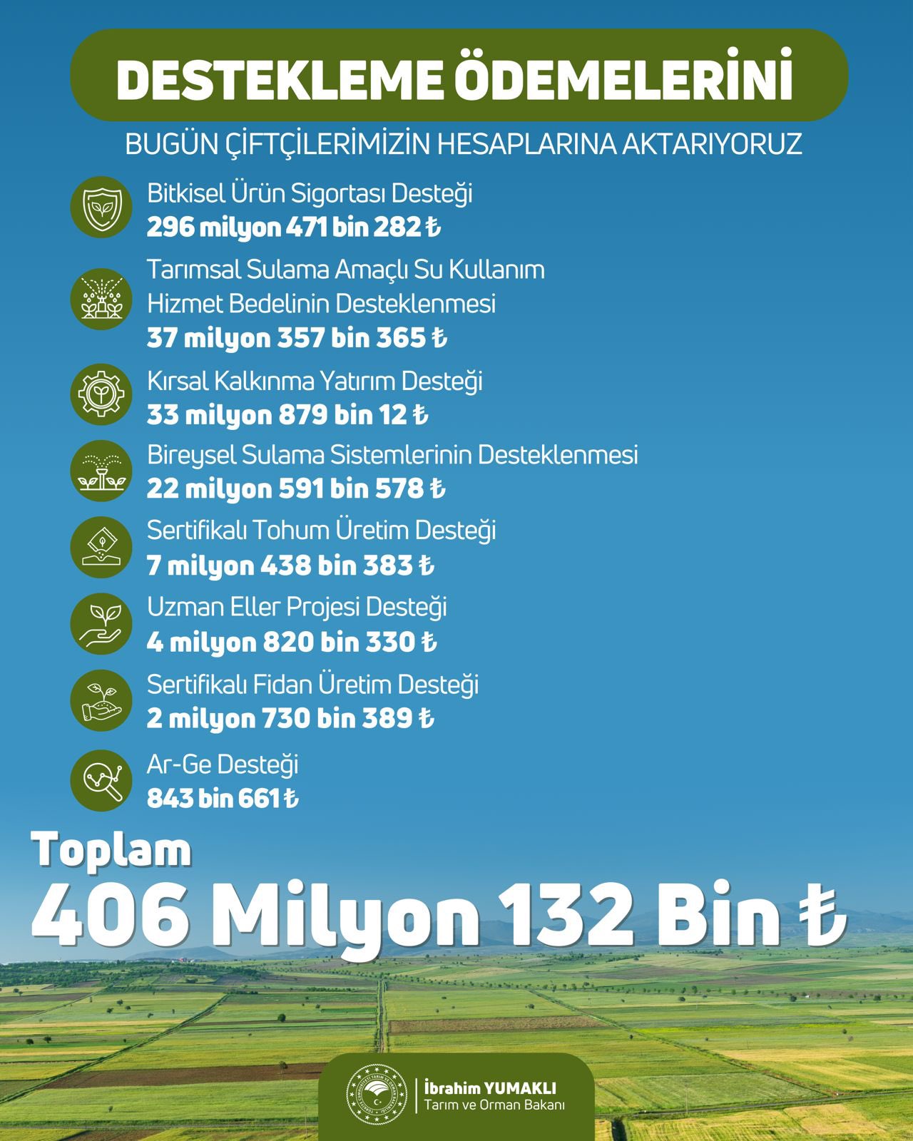 Olmak üzere toplamda 406 milyon 132 bin liralık tarımsal destekleme ödemesi çiftçilerin hesaplarına aktarılacak.