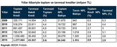 Tarım sektörü açısından 2014 zor geçti. Olumsuz iklim koşullarının etkisiyle tarla, sera ve bahçesi hasara uğrayan üretici birçok üründe zarar etti ama buna rağmen kredi borcuna sadık kaldı. 2014'te 46 milyar TL seviyesine ulaşan tarım kredilerinde takipteki kredi oranı %2.9 oldu. Kredilerde öteleme ve yapılandırma ise kaçınılmaz oldu.<br />