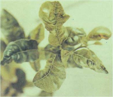 Hastalık ilerledikçe yaprakların kenarlarında kırmızımtırak ve kahverengi kurumalar görülür ve çoğu kez yaprağın tüm çevresini kaplar.