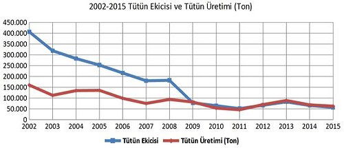 Buna paralel olarak da tütün üretimi 2002 yılında 159 bin 521 ton iken yüzde 61,1 azalarak 2015 yılında yaklaşık 62 bin ton civarına gerilemiş.