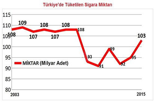 Son 15 yılda ilk defa 2008-2011 yılları arasında yüzde 15'lik bir düşüş gösteren sigara tüketiminin 100 milyar adedin altına indiğine dikkat çekilen raporda, tüketimin 2012 yılında 8 milyar adetlik artışla tekrar 100 milyar sınırına dayandığı ve 2015 yılı itibarıyla 103,2 milyar adede yükseldiğine dikkat çekiliyor.