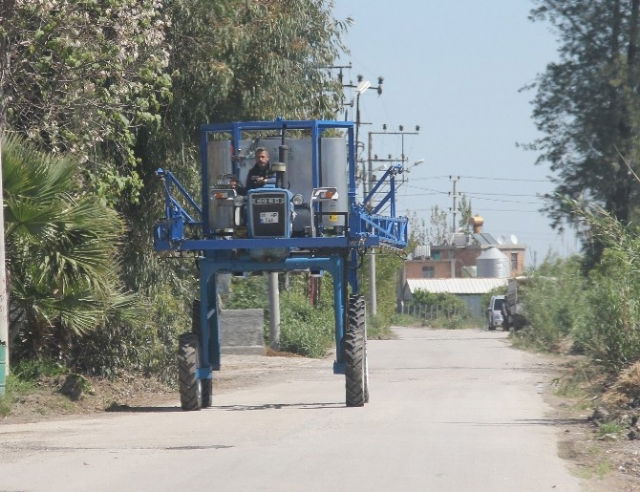 Adanalı çiftçilerin uçakla ilaçlama yasağının ardından ürünlerini ilaçlamak için yaptırdığı "uzun bacak" traktör görenleri şaşırtıyor.